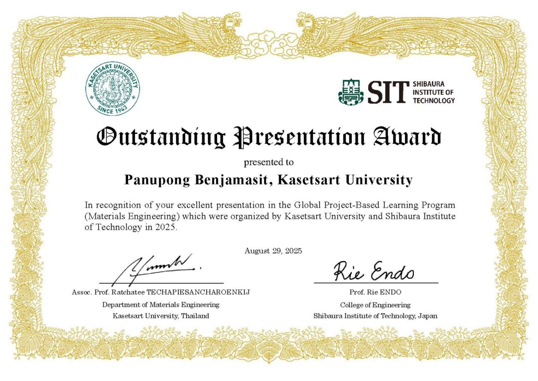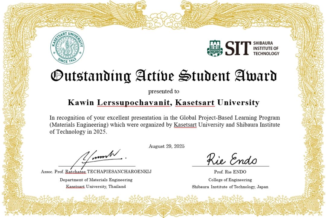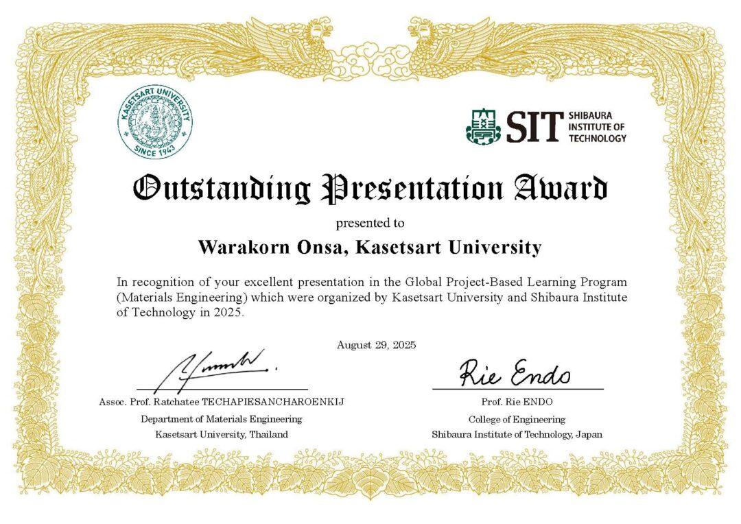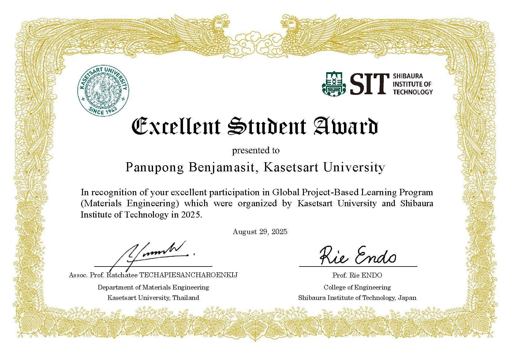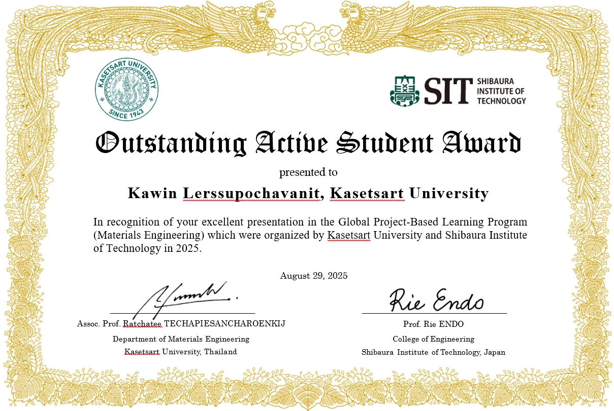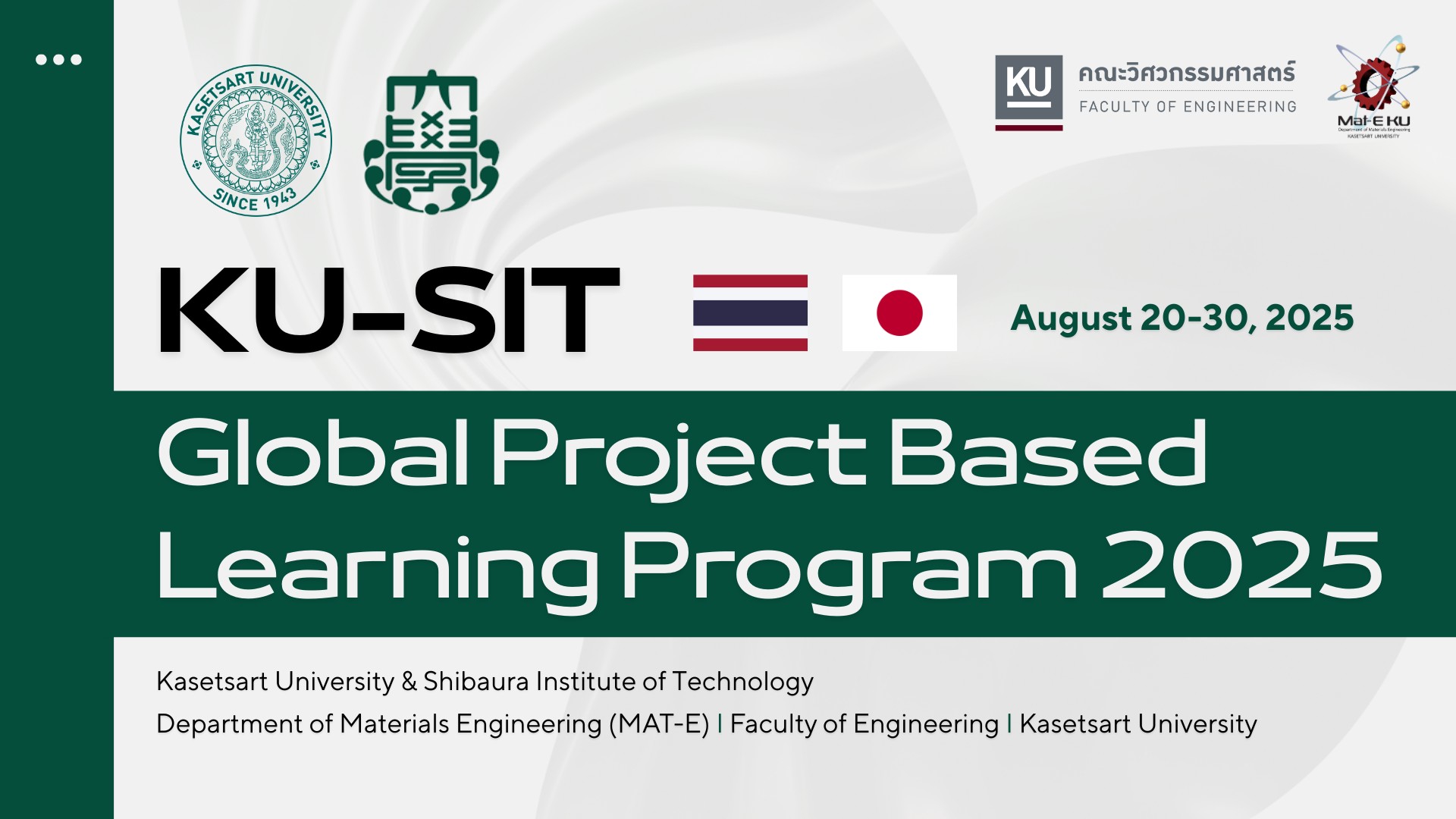 The KU–SIT Global Project-Based Learning (g-PBL) Program 2025 officially commenced on August 21, 2025, hosted by the Department of Materials Engineering, Faculty of Engineering, Kasetsart University, in collaboration with the Department of Materials Science and Engineering, Faculty of Engineering, Shibaura Institute of Technology, Japan. The program takes place from August 21–30, 2025 at Kasetsart University.