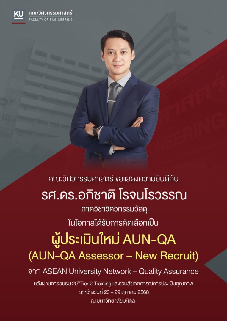 ขอแสดงความยินดีกับ รองศาสตราจารย์ ดร. อภิชาติ โรจนโรวรรณ ภาควิชาวิศวกรรมวัสดุ ในโอกาสได้รับการคัดเลือกจาก ASEAN University Network – Quality Assurance (AUN-QA) ให้เป็น ผู้ประเมินใหม่ (AUN-QA Assessor – New Recruit) ภายหลังผ่านการอบรม 20th Tier 2 Training ณ มหาวิทยาลัยมหิดล ประเทศไทย ระหว่างวันที่ 23 – 29 ตุลาคม 2568 และได้เข้าร่วมสังเกตการณ์ในการตรวจประเมินคุณภาพการศึกษาระดับหลักสูตรตามเกณฑ์ AUN-QA ครั้งที่ 478 ณ มหาวิทยาลัยมหิดล (The 478th AUN-QA Programme Assessment at Mahidol University)
