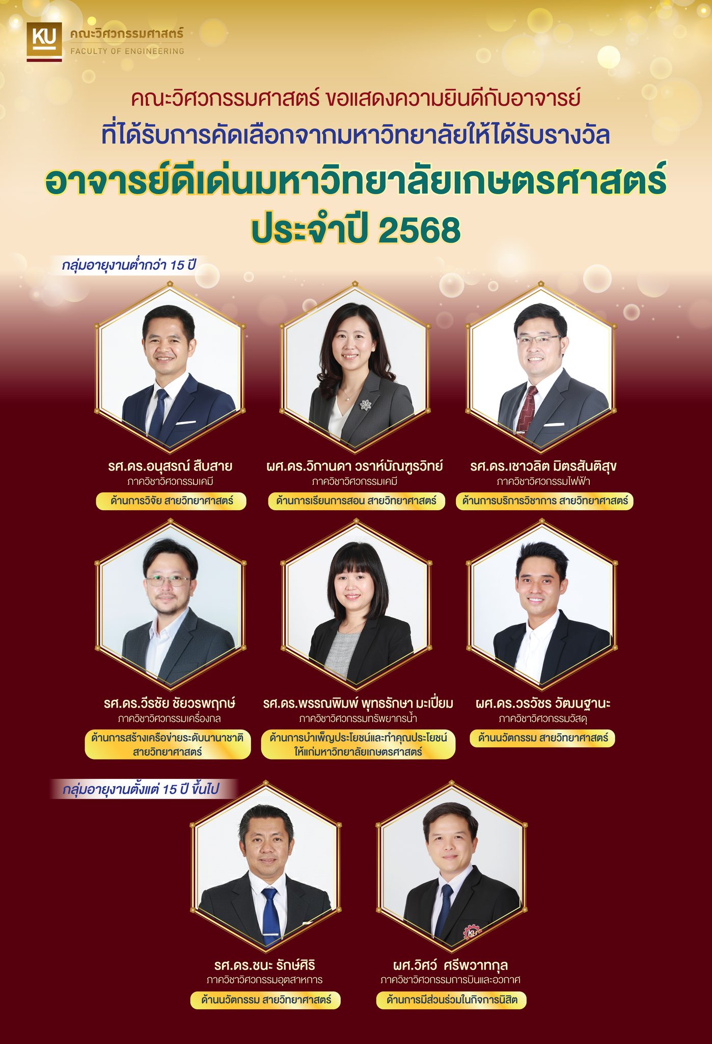 อาจารย์คณะวิศวฯ ได้รับคัดเลือกให้เป็น อาจารย์ดีเด่นของมหาวิทยาลัยเกษตรศาสตร์ ประจำปี 2568