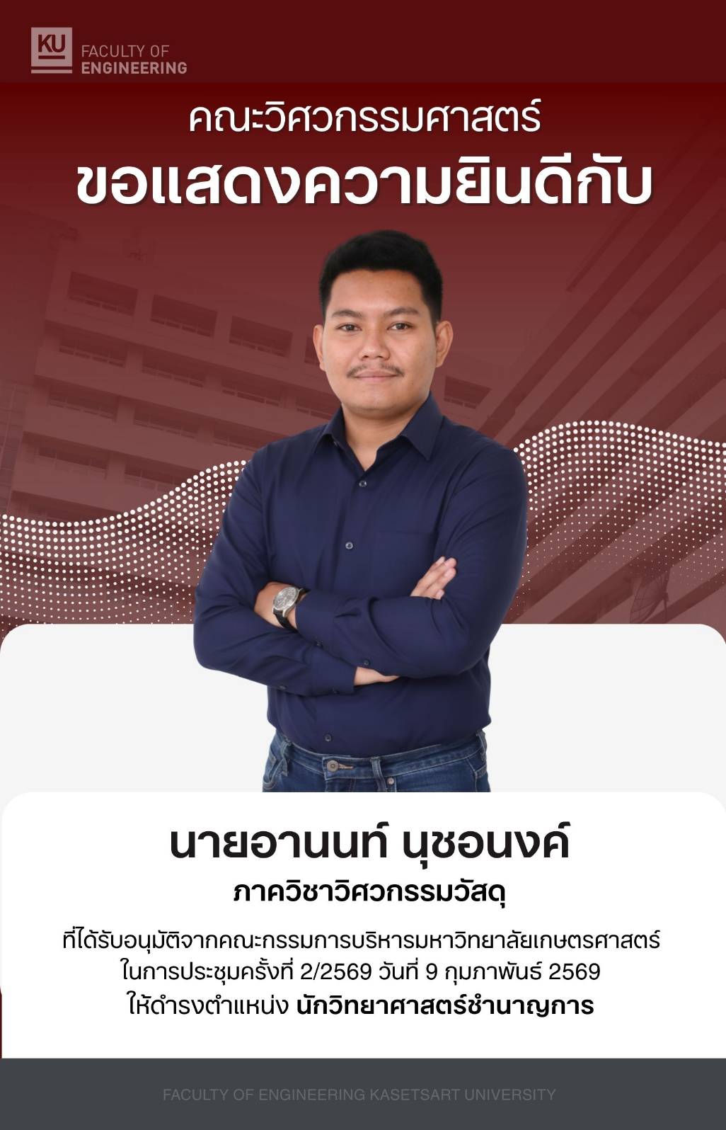 ขอแสดงความยินดีกับนายอานนท์ นุชอนงค์ ที่ได้รับการอนุมัติให้ดำรงตำแหน่งนักวิทยาศาสตร์ชำนาญการ 12 กุมภาพันธ์ 2569 11:29 ข่าวทั่วไป ขอแสดงความยินดีกับบุคลากรสายสนับสนุนที่ได้รับการอนุมัติจากคณะกรรมการบริหารมหาวิทยาลัยเกษตรศาสตร์ ในการประชุมครั้งที่ 2/2569 วันที่ 9 กุมภาพันธ์ 2569 ให้ดำรงตำแหน่งระดับชำนาญงานและชำนาญการ(cracker)ดังนี้ 1. นายอานนท์ นุชอนงค์ ภาควิชาวิศวกรรมวัสดุ ให้ดำรงตำแหน่ง นักวิทยาศาสตร์ชำนาญการ FacebookFacebookXXLINELine PrevPreviousขอแสดงความยินดีกับนิสิตภาควิชาวิศวกรรมวัสดุ ได้รับรางวัลโครงการประกวดผลงานด้านความยั่งยืน (SDGs) Nextขอแสดงความยินดีกับนางสาวปาริชาติ ชะอุ่ม ที่ได้รับการอนุมัติให้ดำรงตำแหน่ง นักวิจัยชำนาญการNext