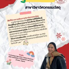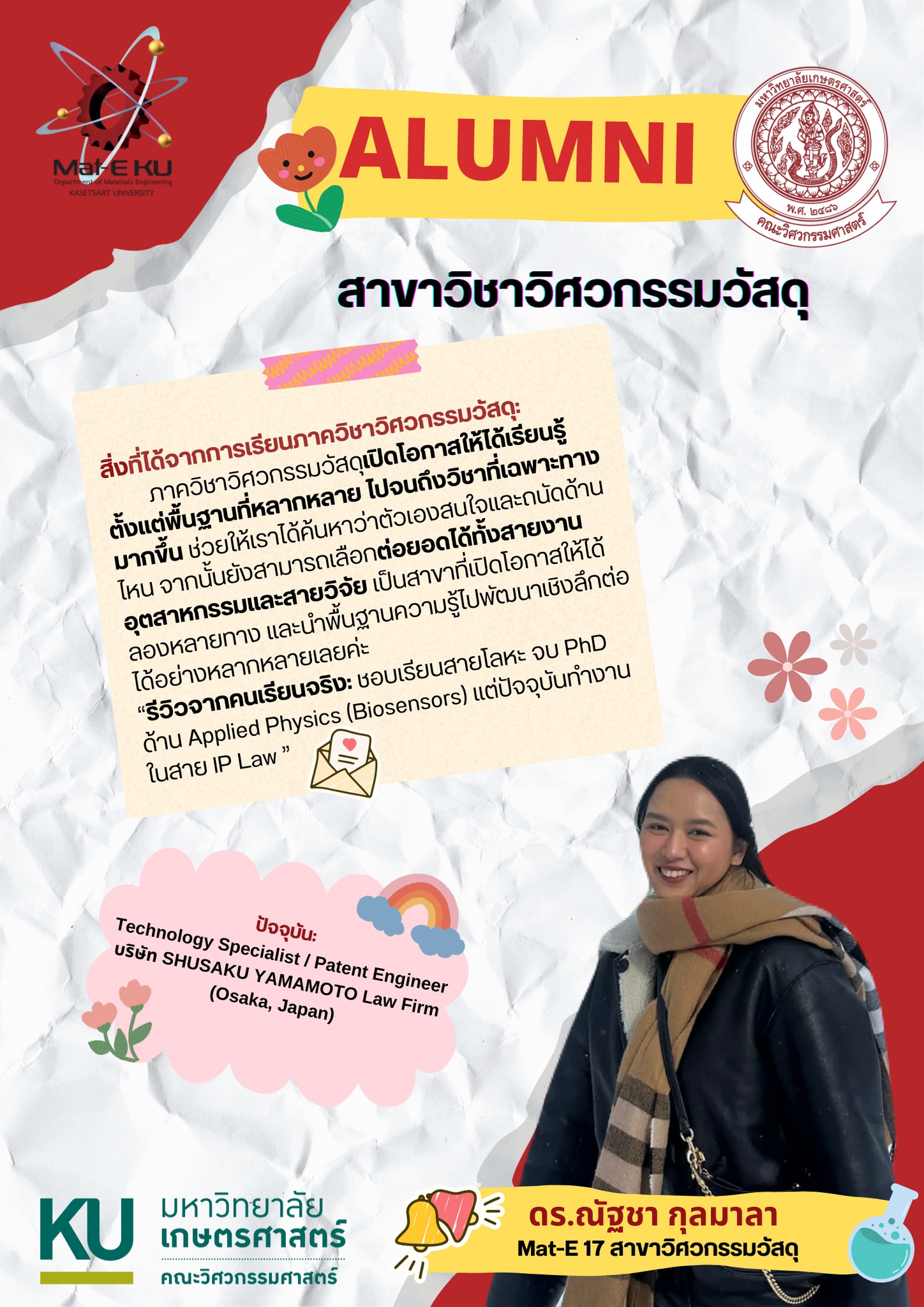 เข้าสู่ช่วง TCAS69 สคูป #วิศวกรรมวัสดุจบแล้วทำงานอะไร ของเราในรอบนี้ ได้รับเกียรติจาก พี่แบม หรือ ดร.แบม (MatE17, KU74, E70) มาแชร์สายงานของวิศวกรรมวัสดุ ในบริษัทด้านกฎหมายสิทธิบัตรนานาชาติ ที่ประเทศญี่ปุ่น